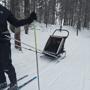 Pyörävaunu Thule chariot kahdelle lapselle, lisävarusteena sukset ja vetovaljaat